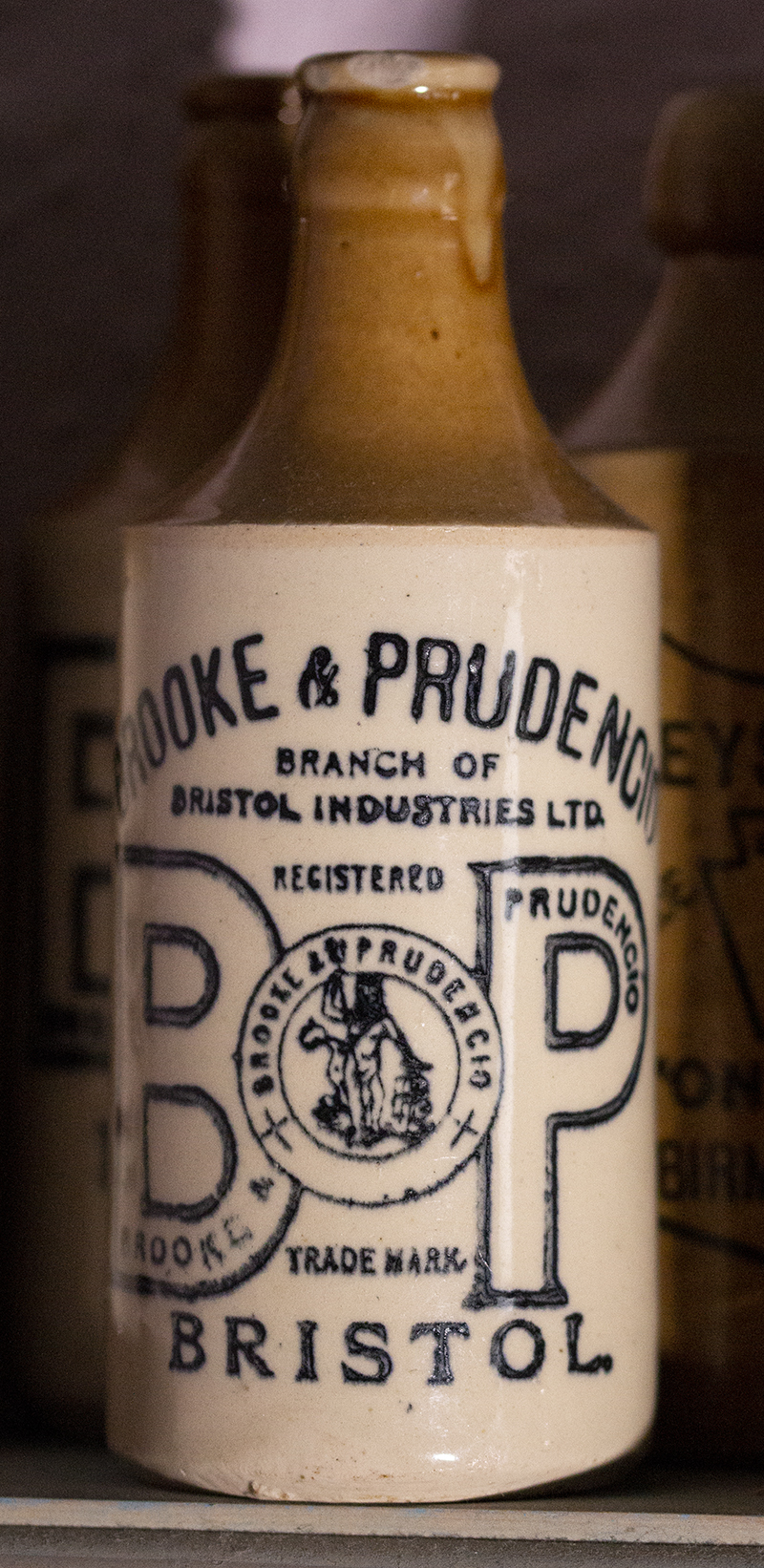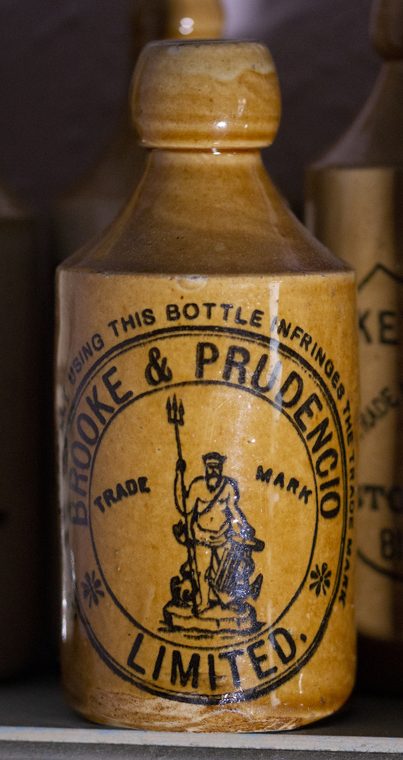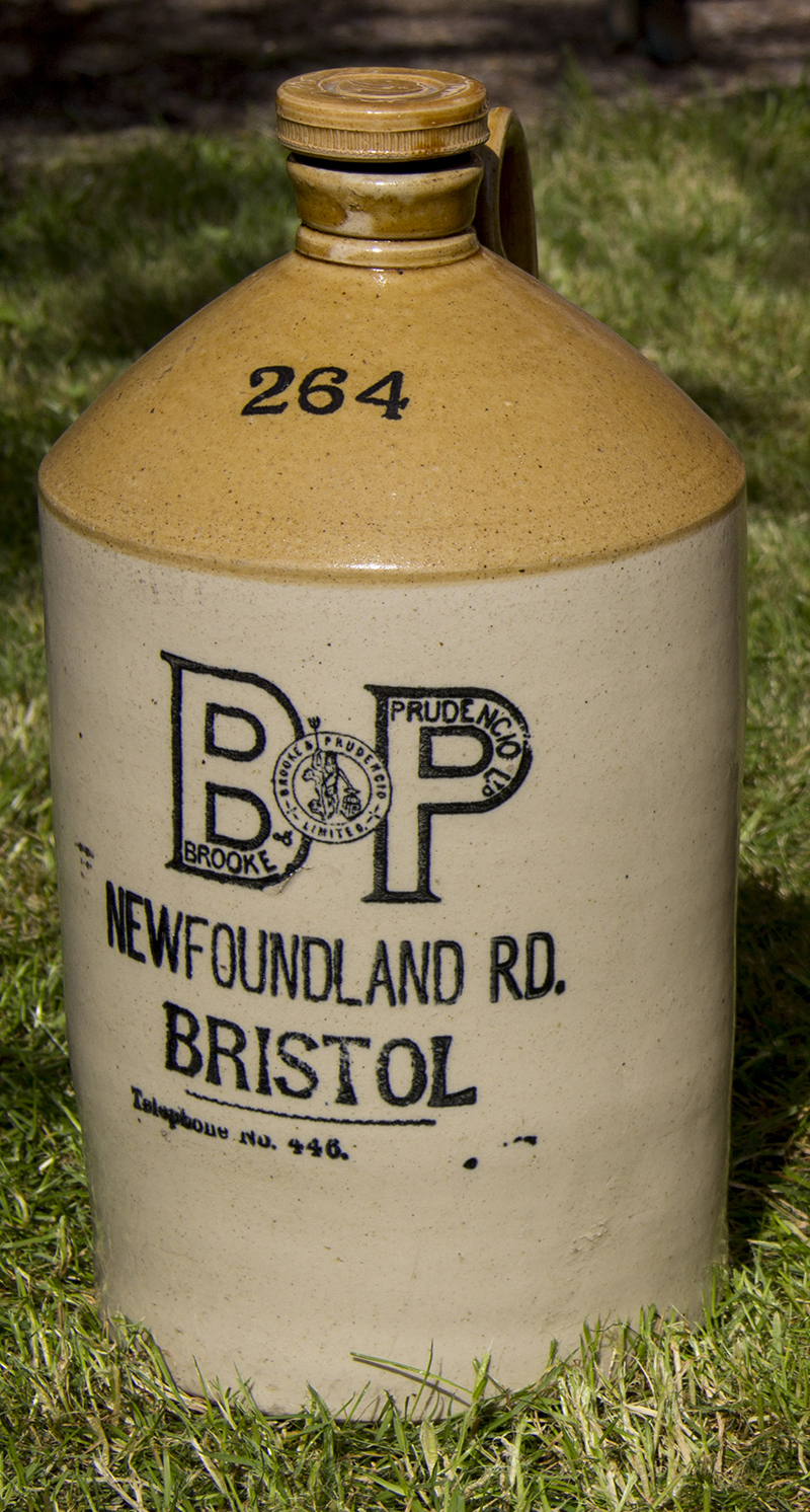 On 22 August 1889 Francisco Prudencio and Thomas Brooke, a long established soda water manufacturer of Capt. Carey's Lane off of Old Market, Bristol, merged their two companies together to form Brooke & Prudencio Limited. The new company premises was at 124-132 (even) Newfoundland Road, demolished for the building of the M32. This was formerly the factory of Barrett's Country Bottling Co. Ltd. During WW2 Brooke & Prudentio were a branch of Bristol Industries Ltd. and has subsidiaries such as the Neptune Direct Supplies Company. Mr. William Stevens was managing director at the demise of Mr. Prudencio. At this time it seems "Limited" was removed from new bottles as the company was now a subsidiary of a larger concern. Also see the war-time restrictions below. After the merger between the two companies the "Neptune" trade mark loses his large fish and acquires the Thomas Brooke anchor entwined with a "B".