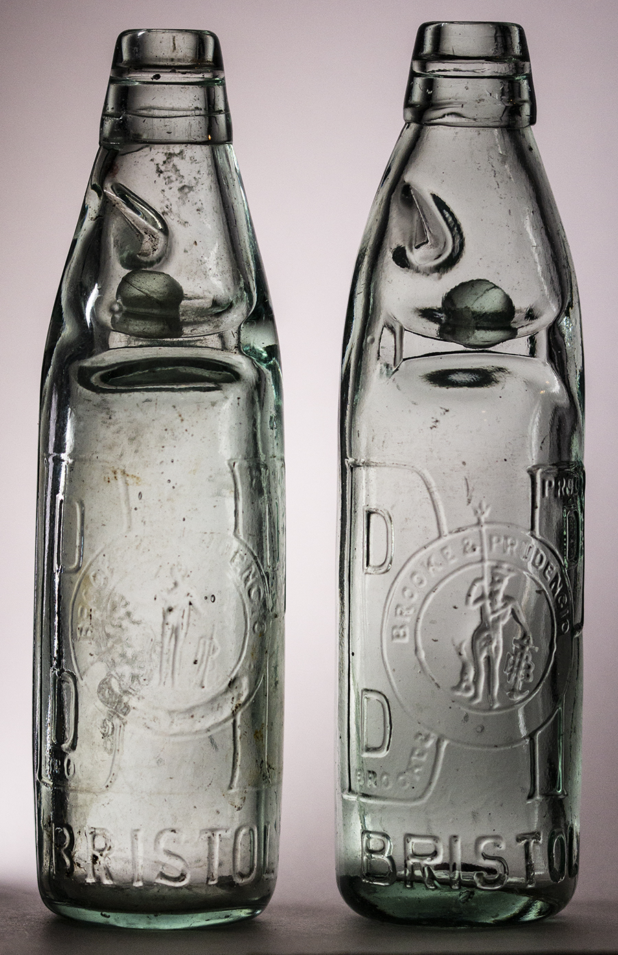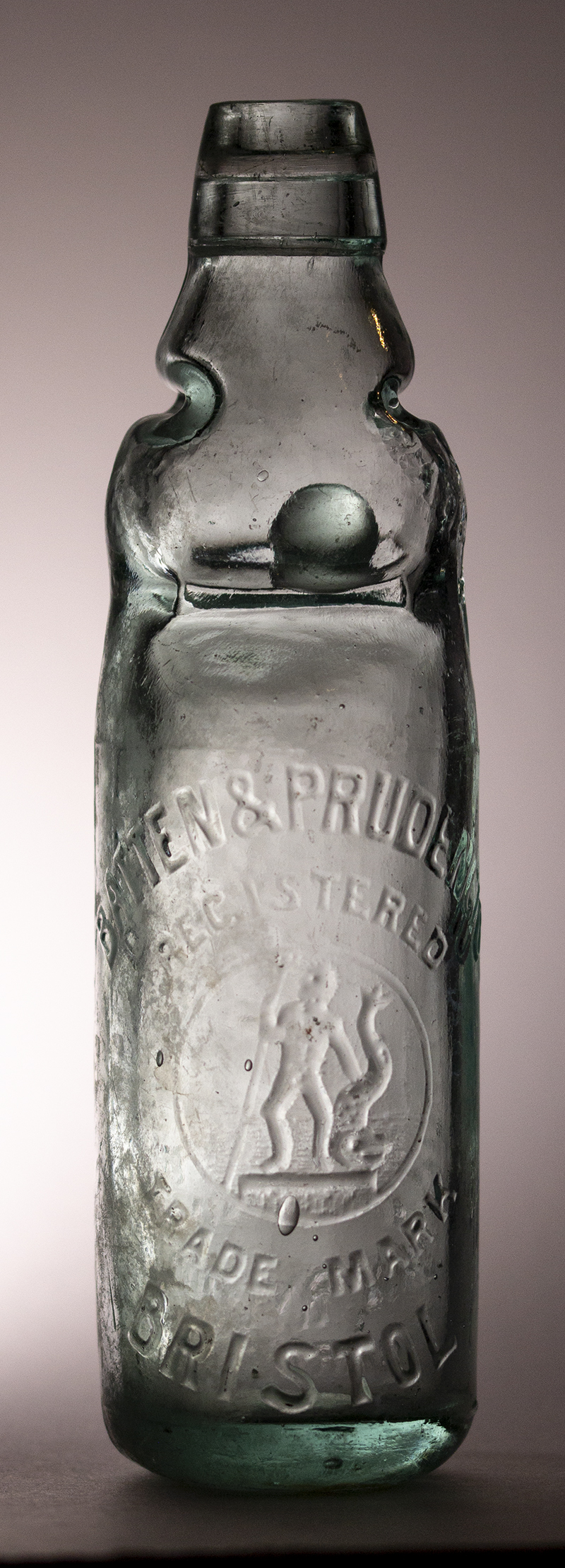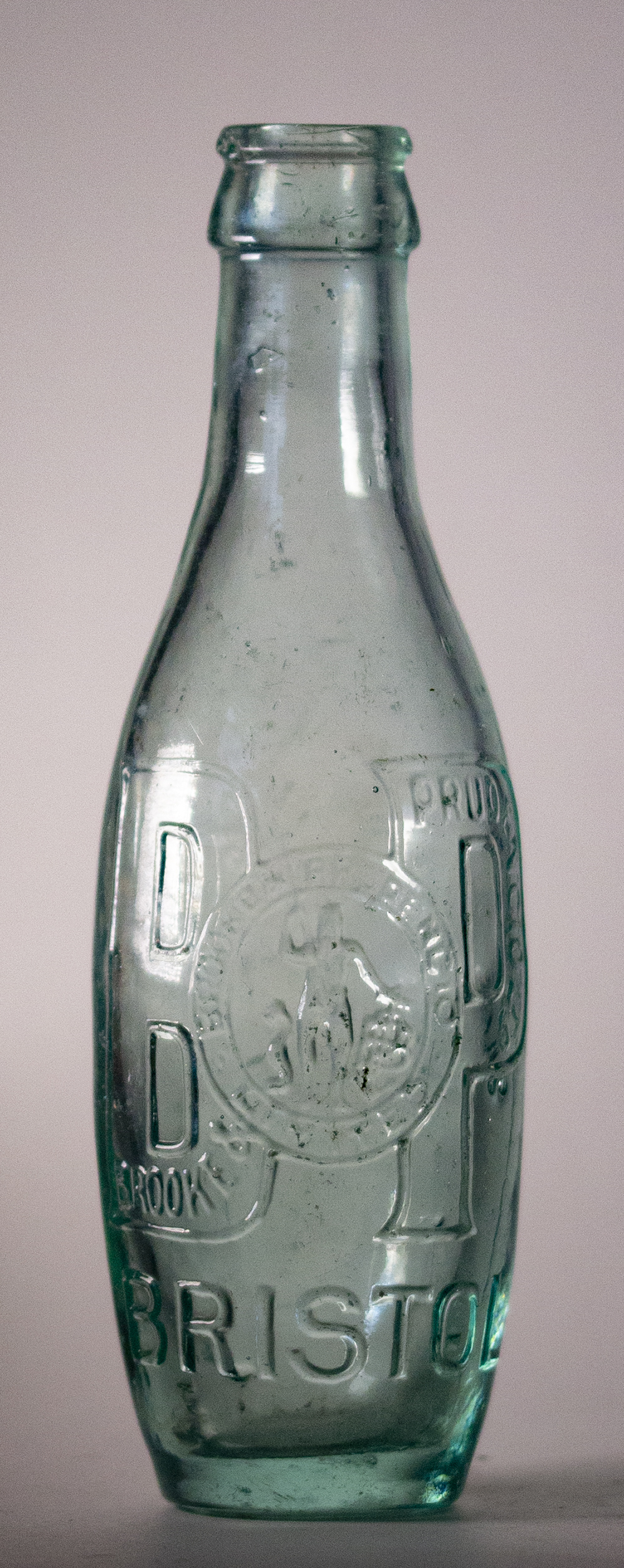 | Clear Glass. Etched in circle: BROOKE & PRUDENCIO / LIMITED / BRISTOL. Pictorial Neptune registered trade mark in centre. B & P LTD to rear. Made in France: Gudret. |