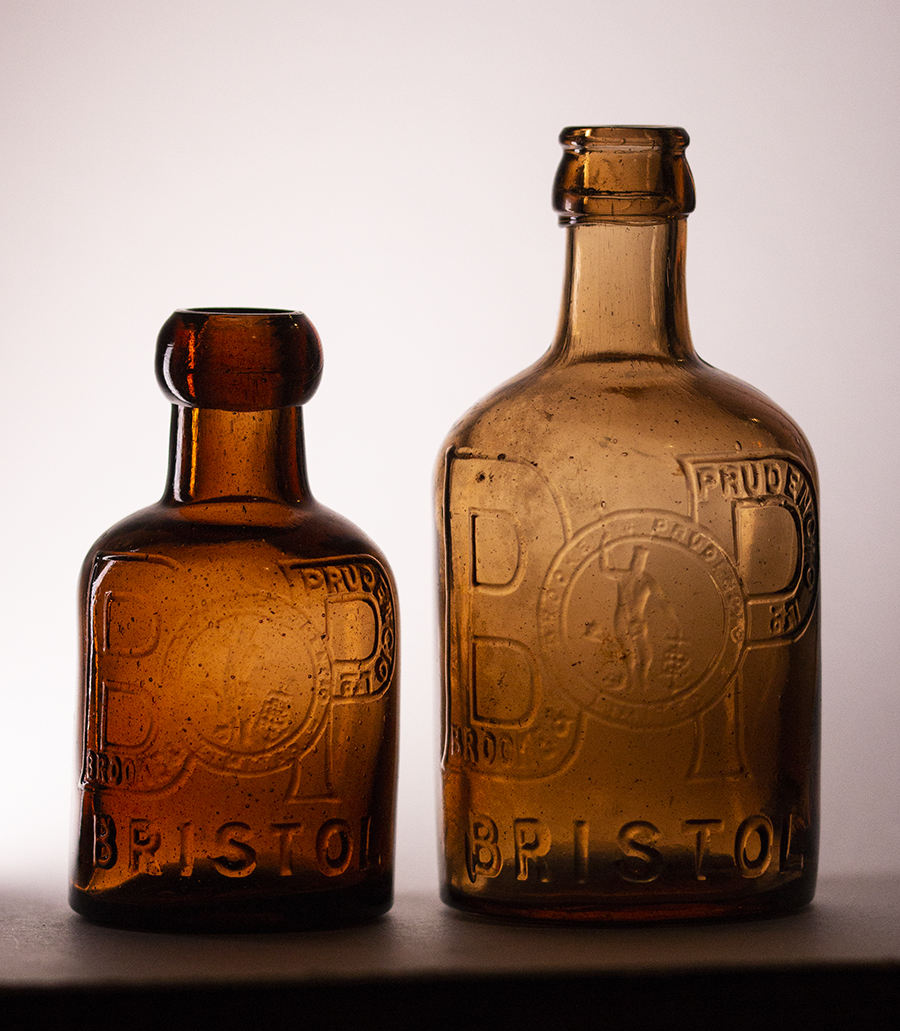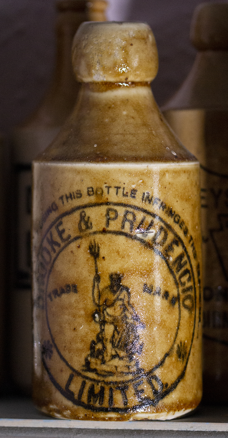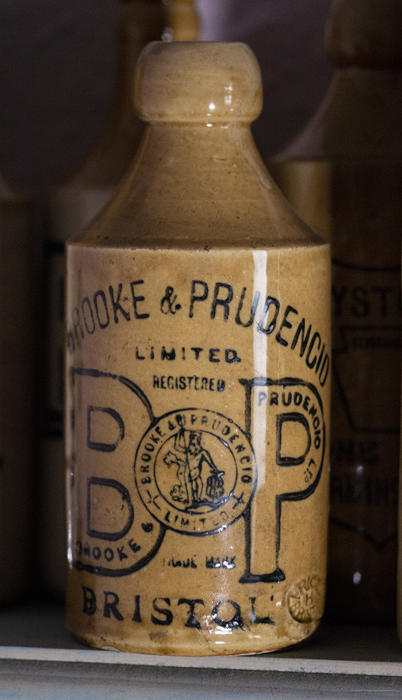 PRUDENCIO BRISTOL around base. Surviving paper "Ginger Beer" label. Potter: unmarked, all white glaze. Crown cap. |