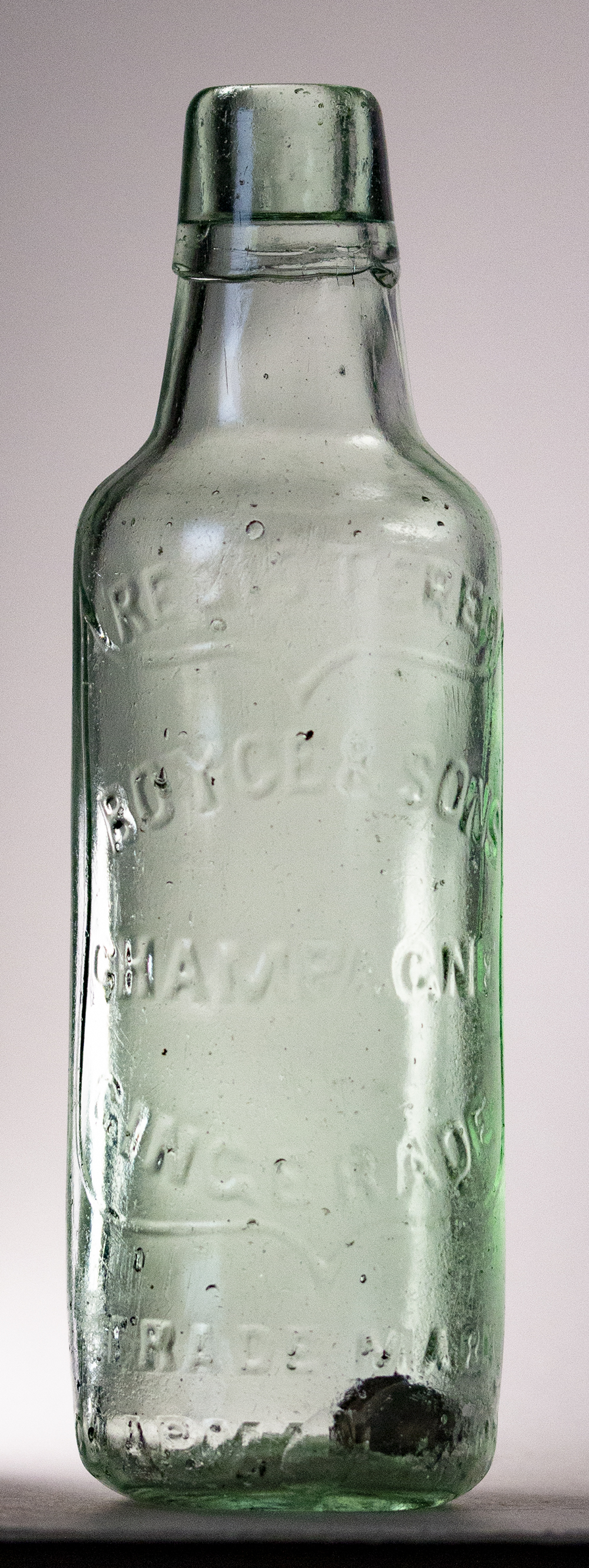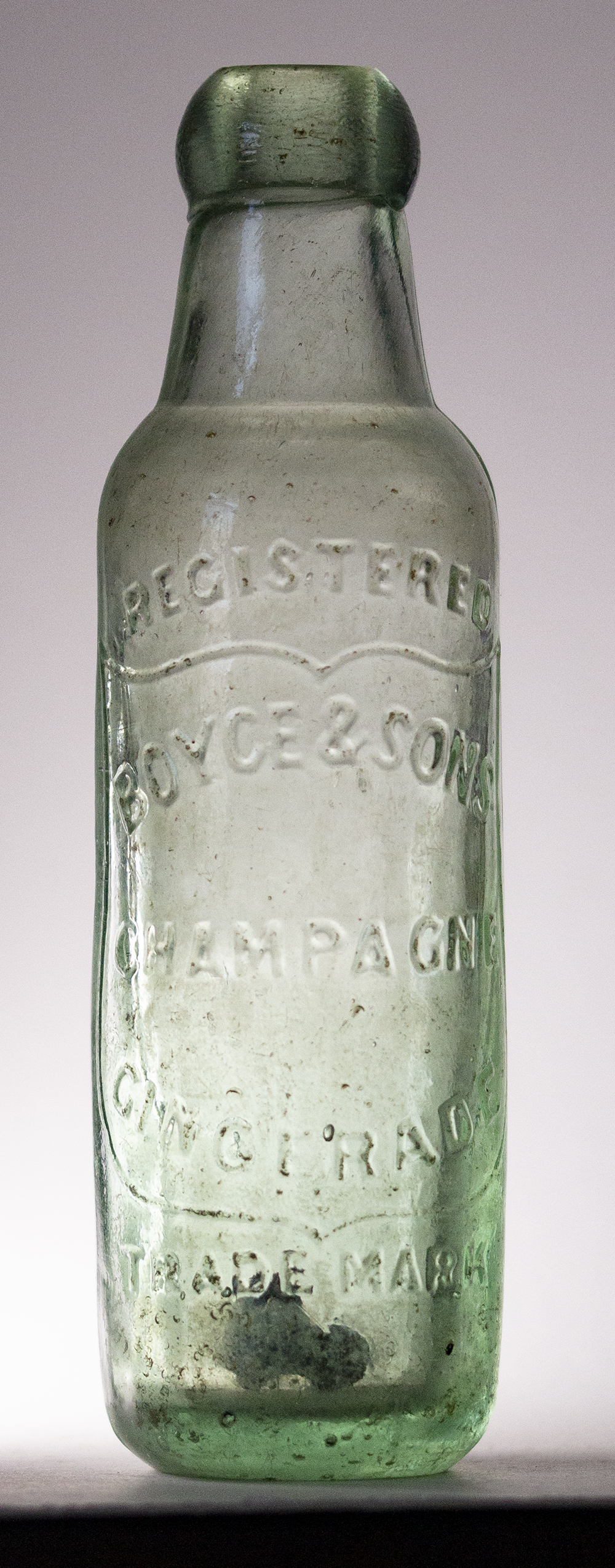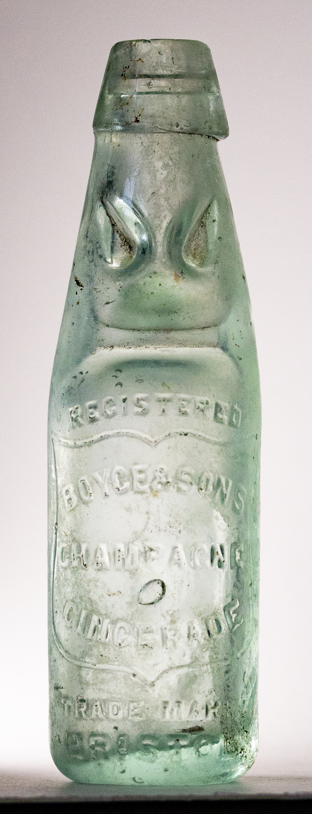 in shield: BOYCE & SON / CHAMPAGNE / GINGERADE. Reverse also in shield: MEADOW STREET / ST. PAULS / BRISTOL Glassworks: not marked. Height 7.25" (18.4cm). |
