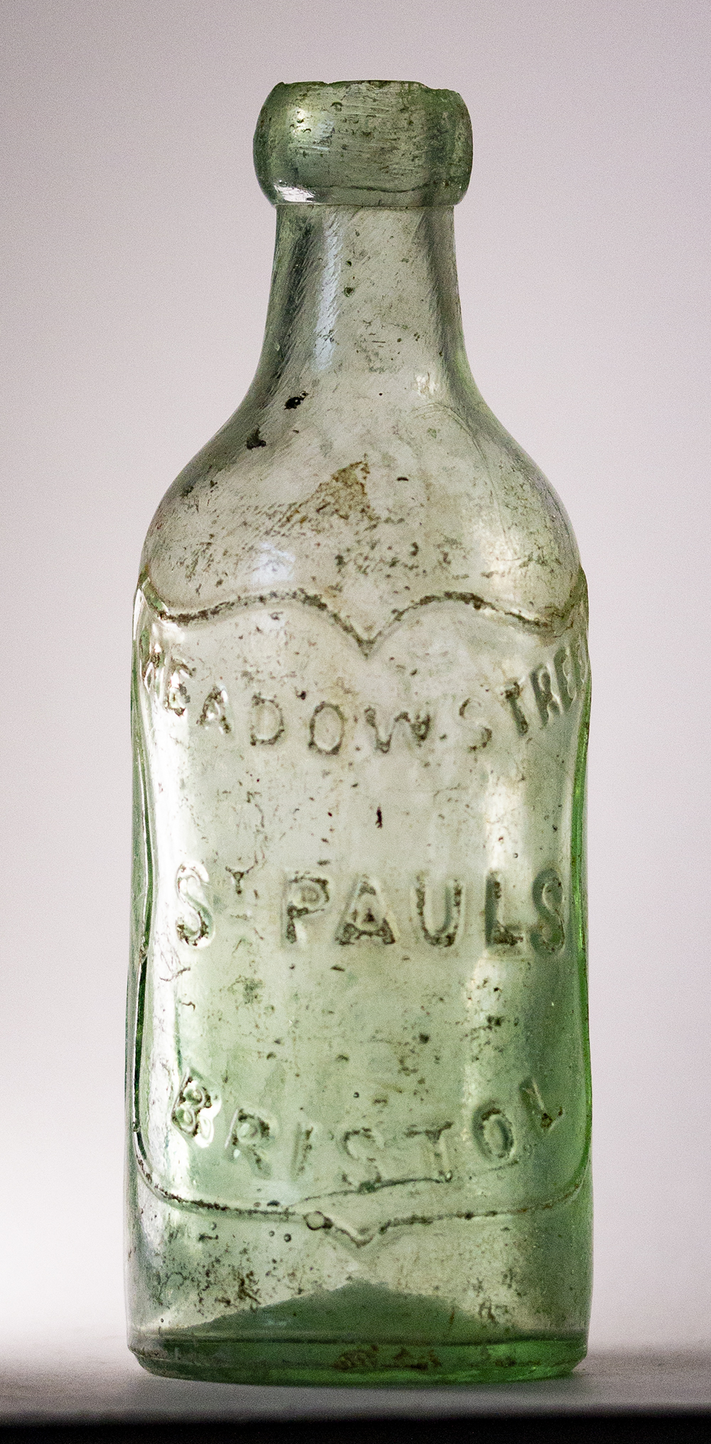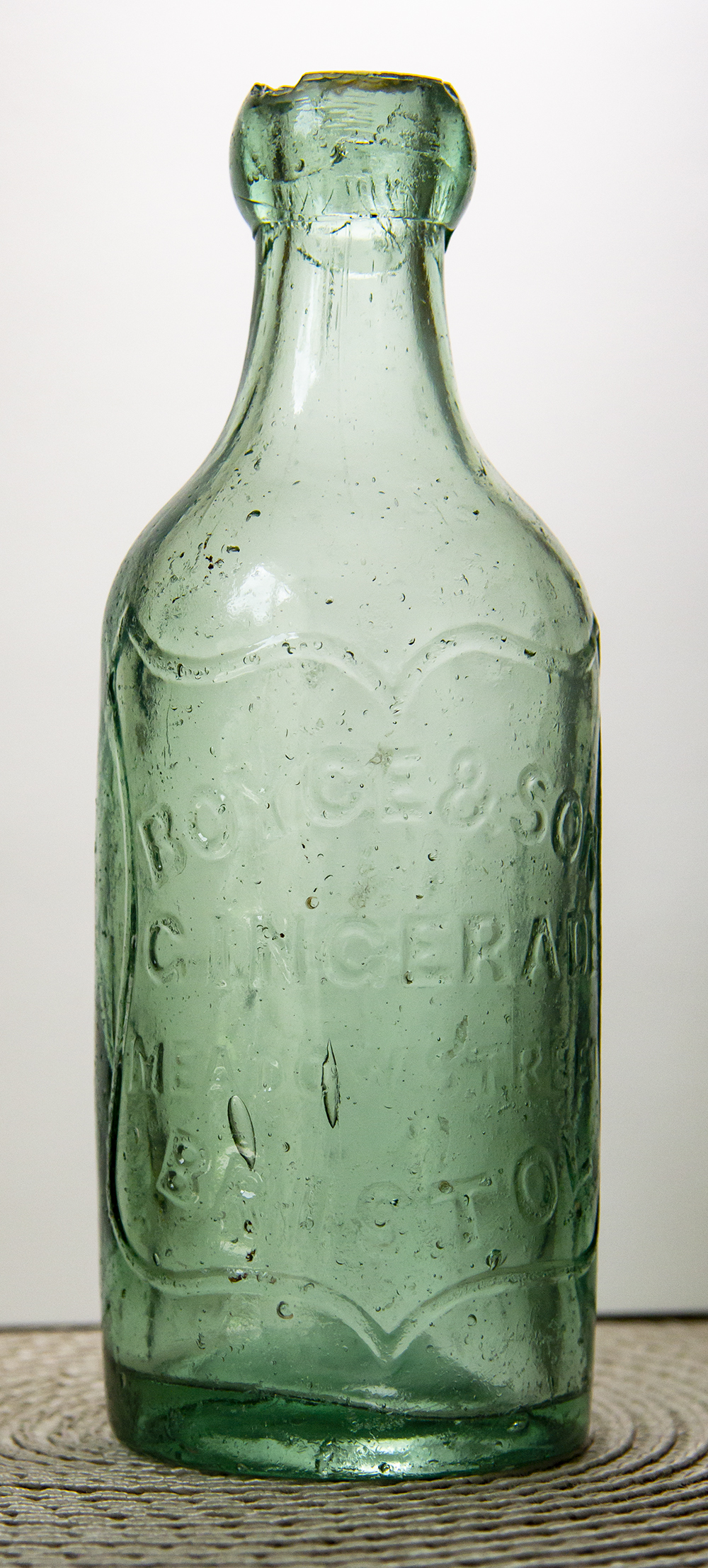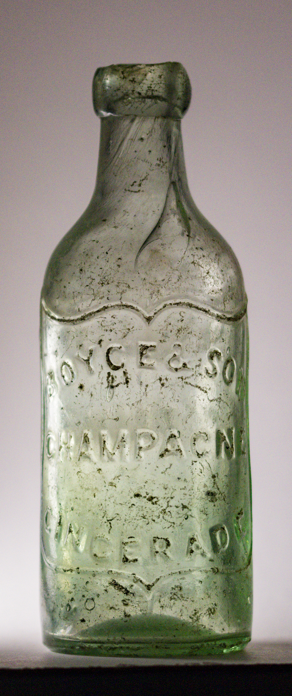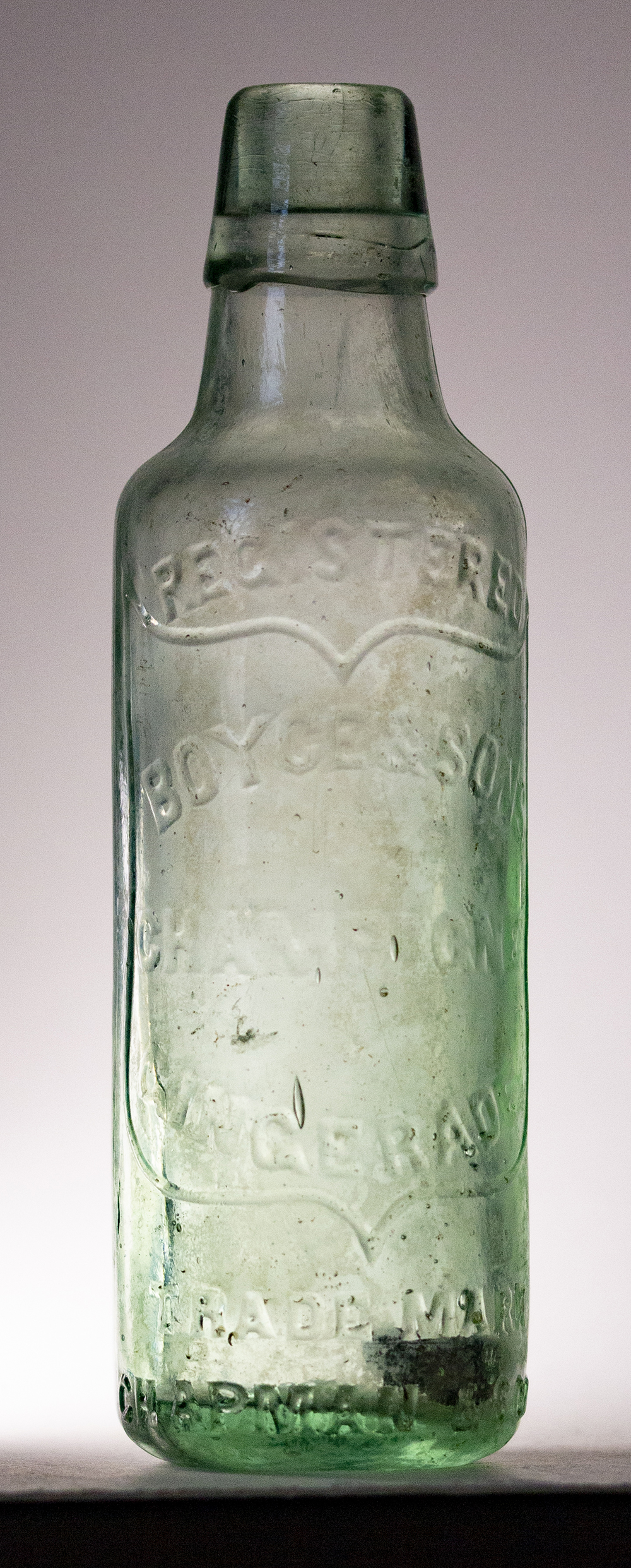 in shield: BOYCE & SON / CHAMPAGNE / GINGERADE. Reverse also in shield: MEADOW STREET / ST. PAULS / BRISTOL Glassworks: not marked. Height 7.25" (18.4cm). |