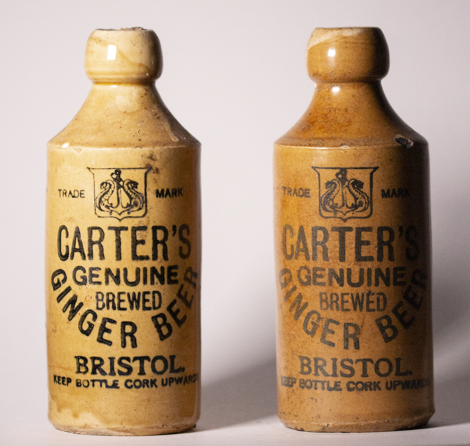 / GENUINE / BREWED / GINGER BEER. Potter: Powell, Bristol (2 examples both 2 tone glaze). |