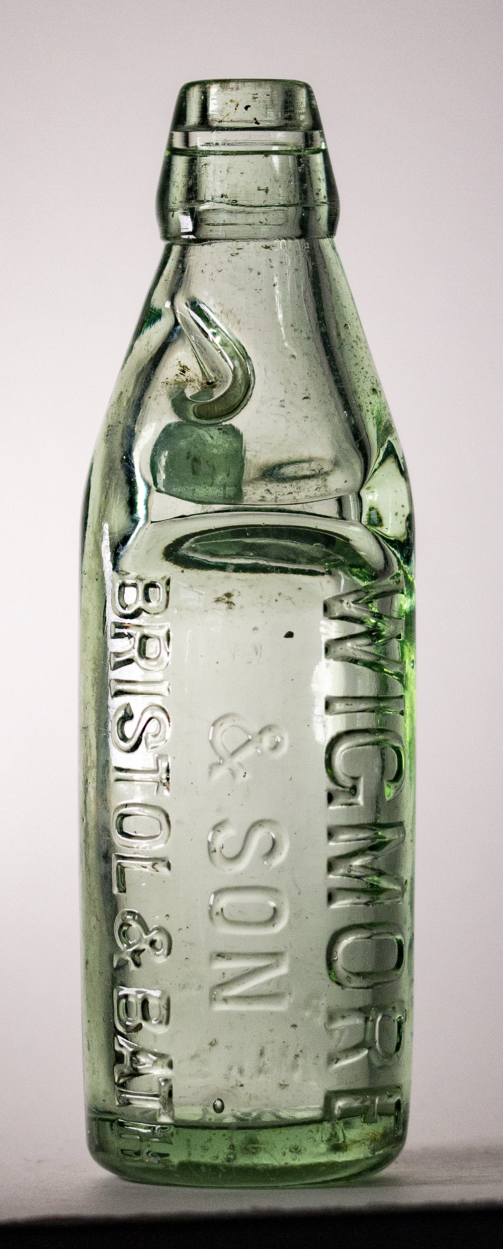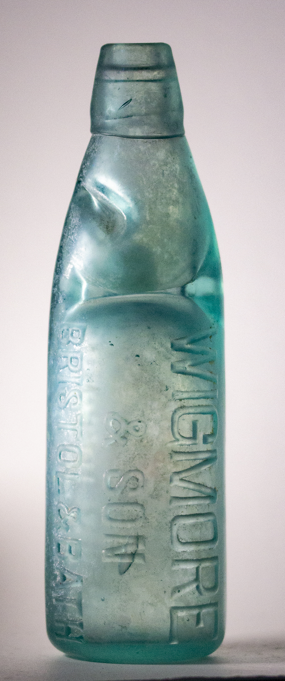 lengthwise: WIGMORE / BRISTOL. In aqua glass. Maker: J. L. & Co. Ld. 2950 (Lumb, Castleford). |