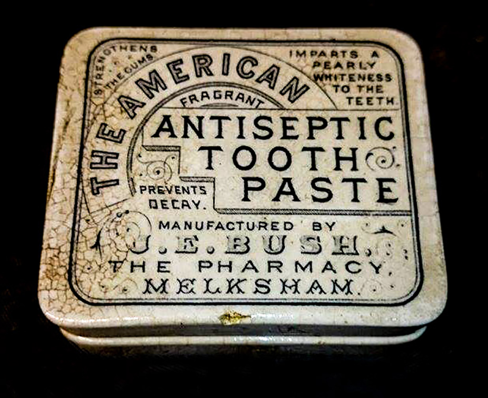 | Rectangular design in white ceramic : THE AMERICAN / ANTISEPTIC / TOOTH / PASTE / J. E. BUSH / THE PHARMACY / MELKSHAM. |