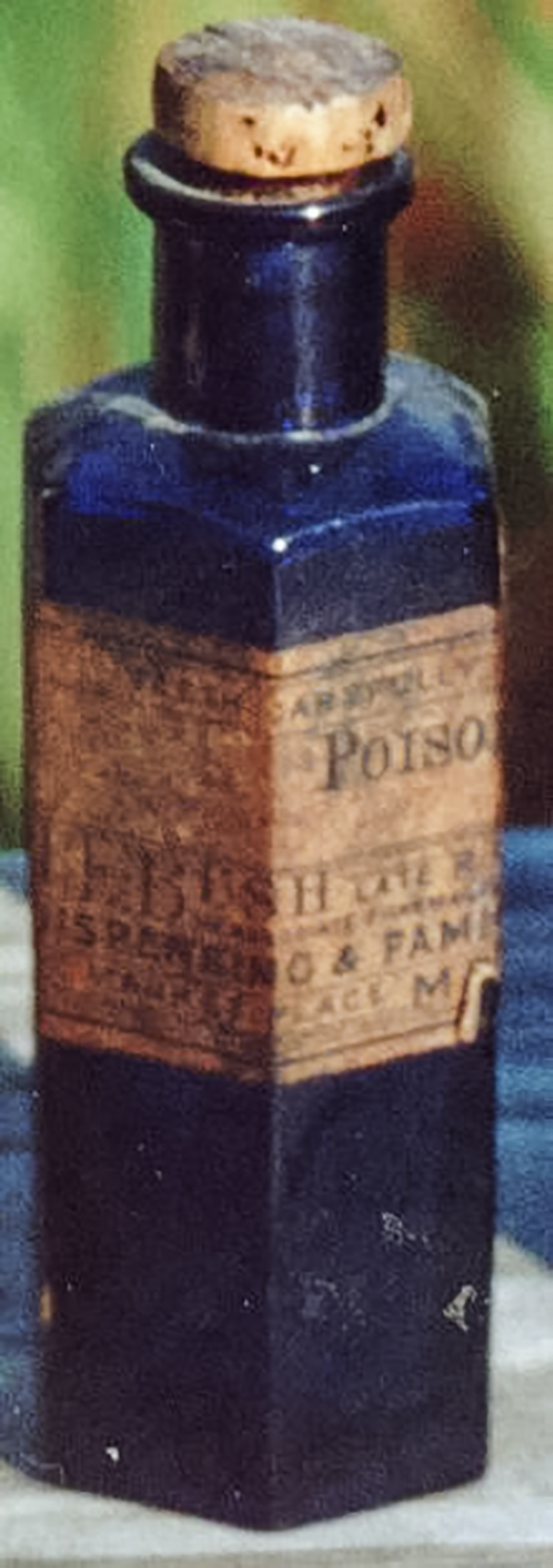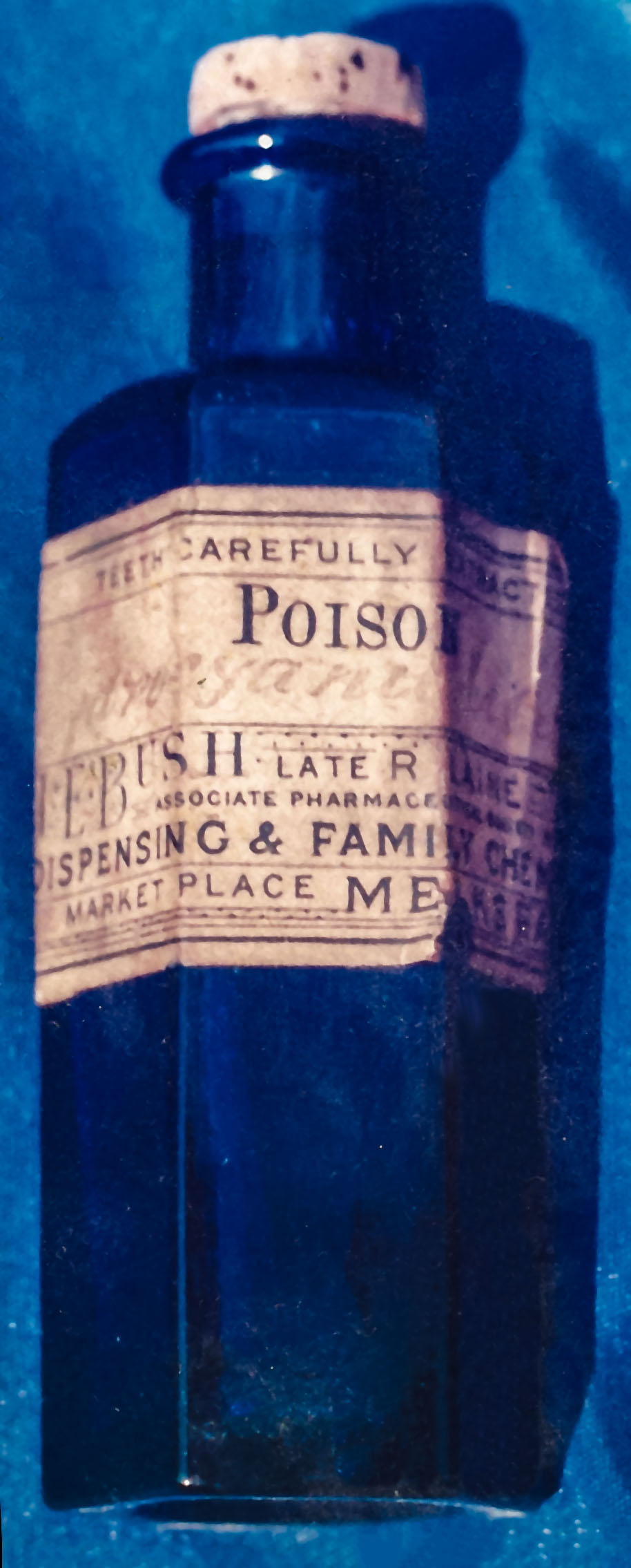 James E. Bush was a Pharmacist born in High Roding, Dunmow, Essex, early 1862. James married his wife Jessie Elizabeth Buck on 4 Sept. 1884 in Great Dunmow. James is entered in the Registers of Pharmaceutical Chemists and Chemists and Druggists (1919) on the 16th Oct. 1889, at Market Place, Melksham: examination Certificate 7934. He was made a member of Chaloner Lodge No. 2644 of Melksham in Feb. 1897 and later became W.M., still trading in the Market Place in 1901 but by 1911 was a Dentist and Dental Anesthetist. He died on the 5th Oct. 1931 at 150 Selhurst Road, South Norwood, Surrey and was cremated, his funeral taking place on Friday 9th Oct. at Melksham Parish Church Cemetary, his ashes were placed in the family vault. His estate was left to his son Edward Philip Dutton Bush, chemist who was born in 1885 in Great Dunmow, and was educated at David G. W. Rumsey's boarding school, Long Street, Devizes.
