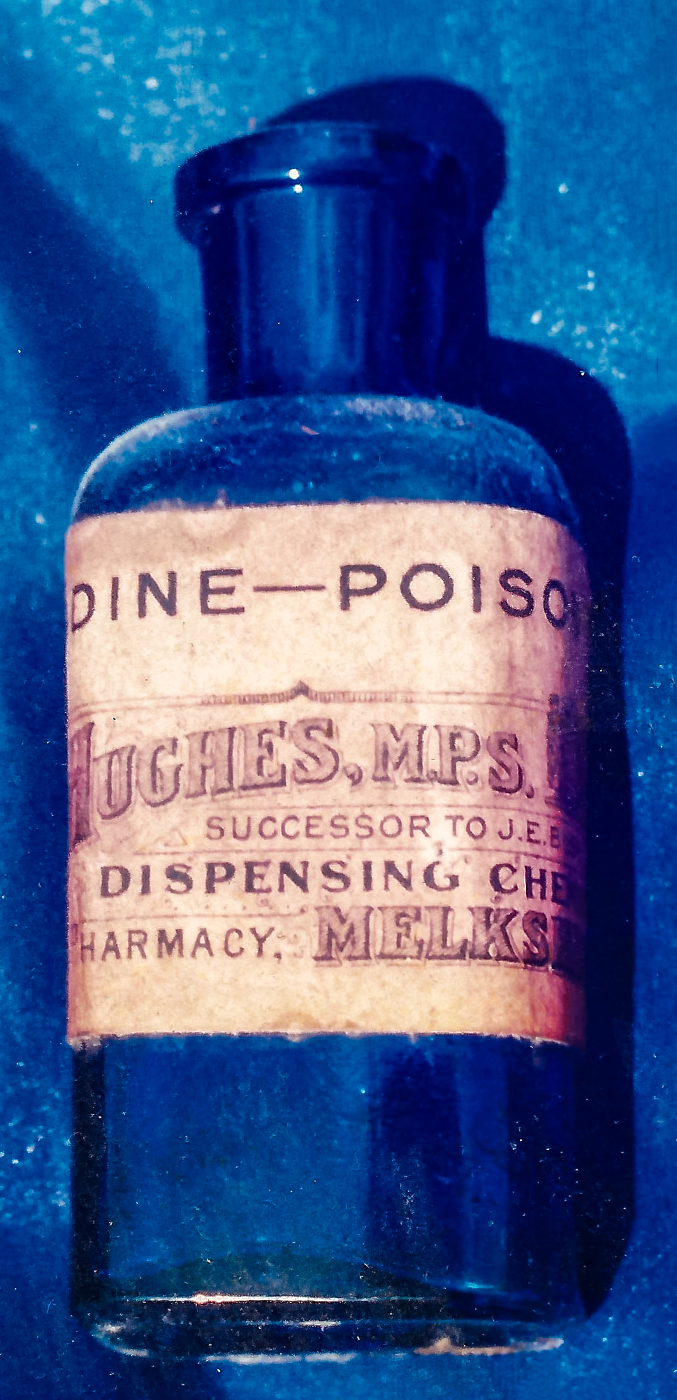 | IODINE-POISON / E. J. HUGHES M.P.S. (coat of arms) / SUCCESSOR TO J. E. BUSH / DISPENSING CHEMIST / THE PHARMACY, MELKSHAM. |