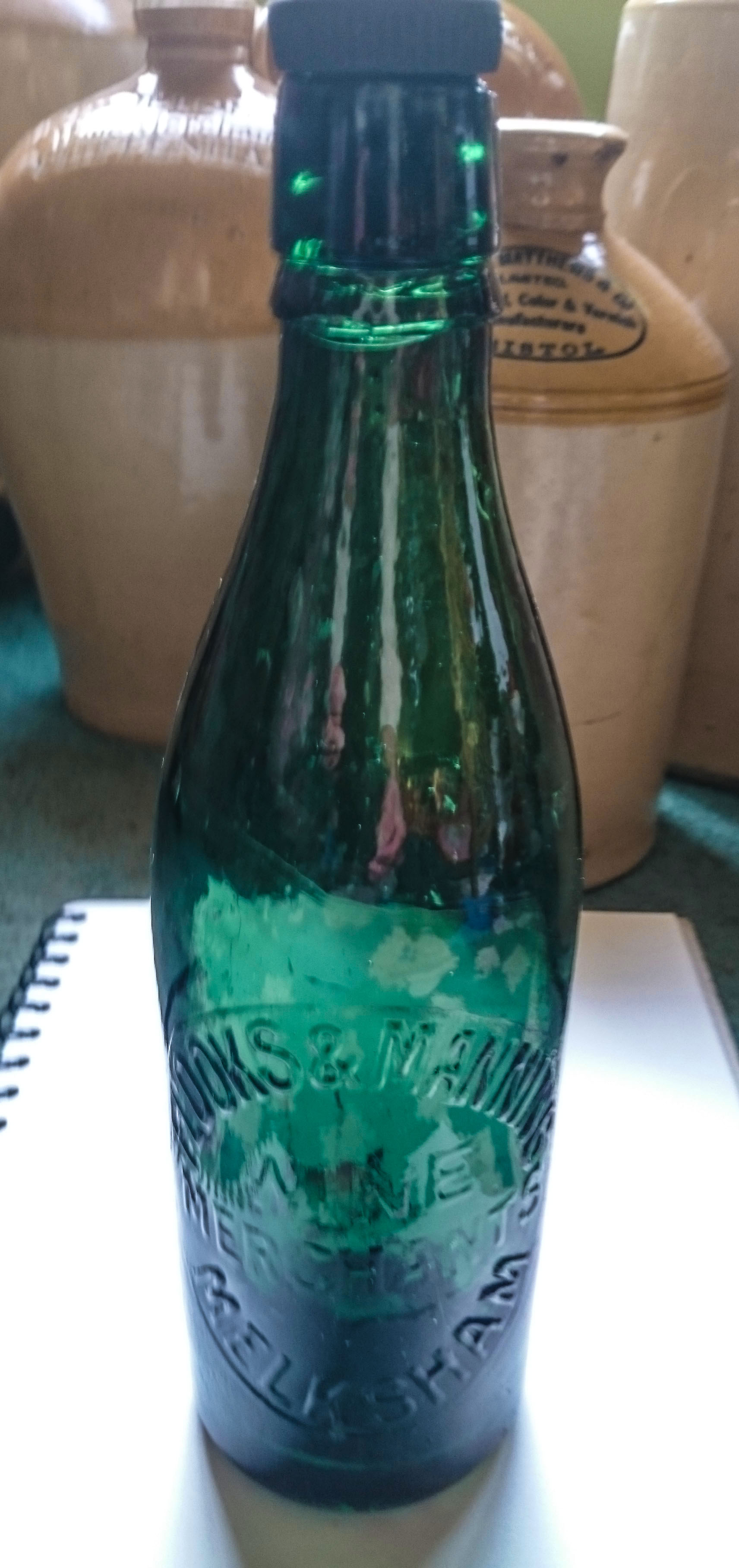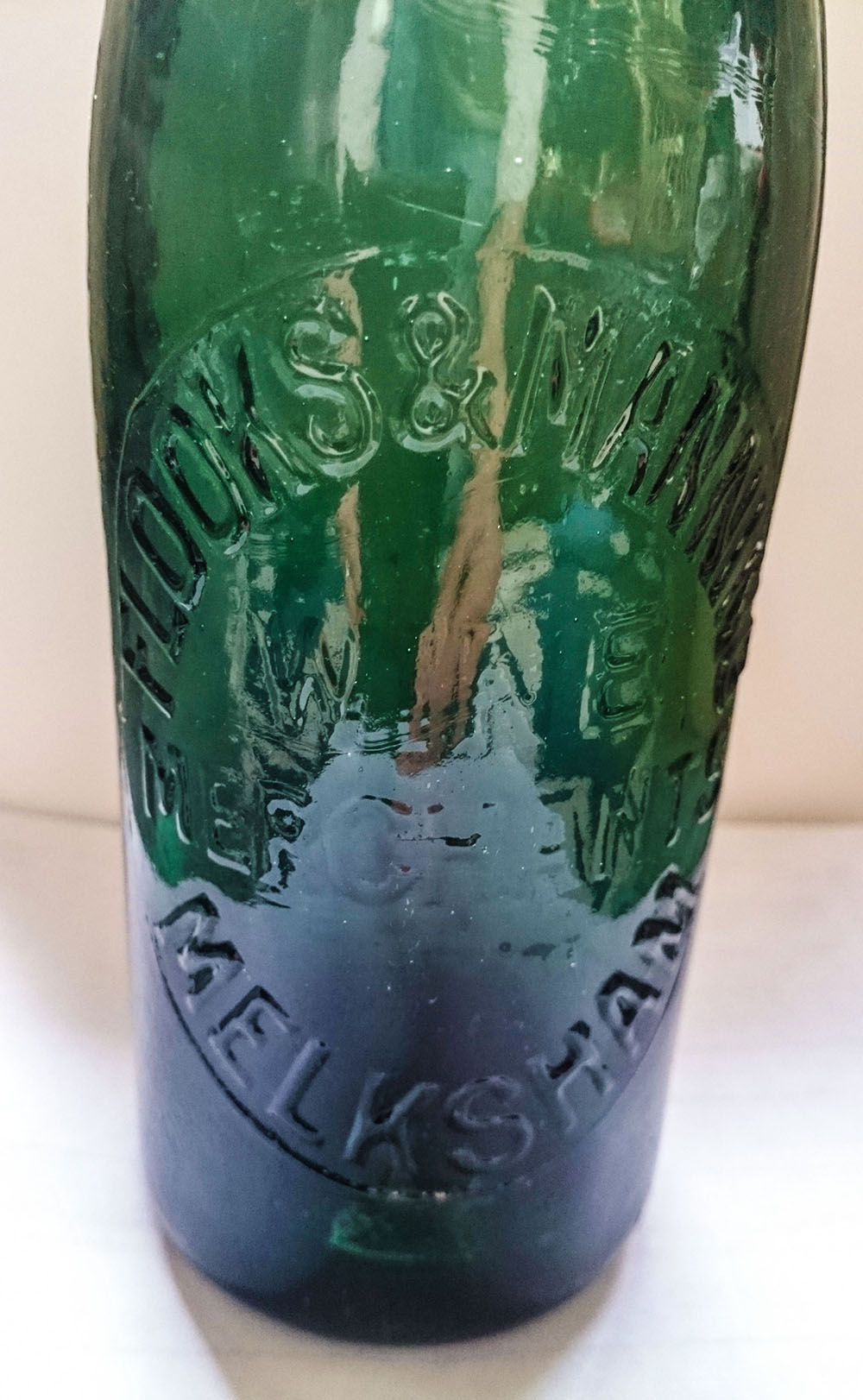 & MANNING / WINE MERCHANTS / MELKSHAM. P. & R. B. on base. (Powell & Ricketts, Bristol glassworks) Dark teal glass. Image courtesy Tony Hughes. |