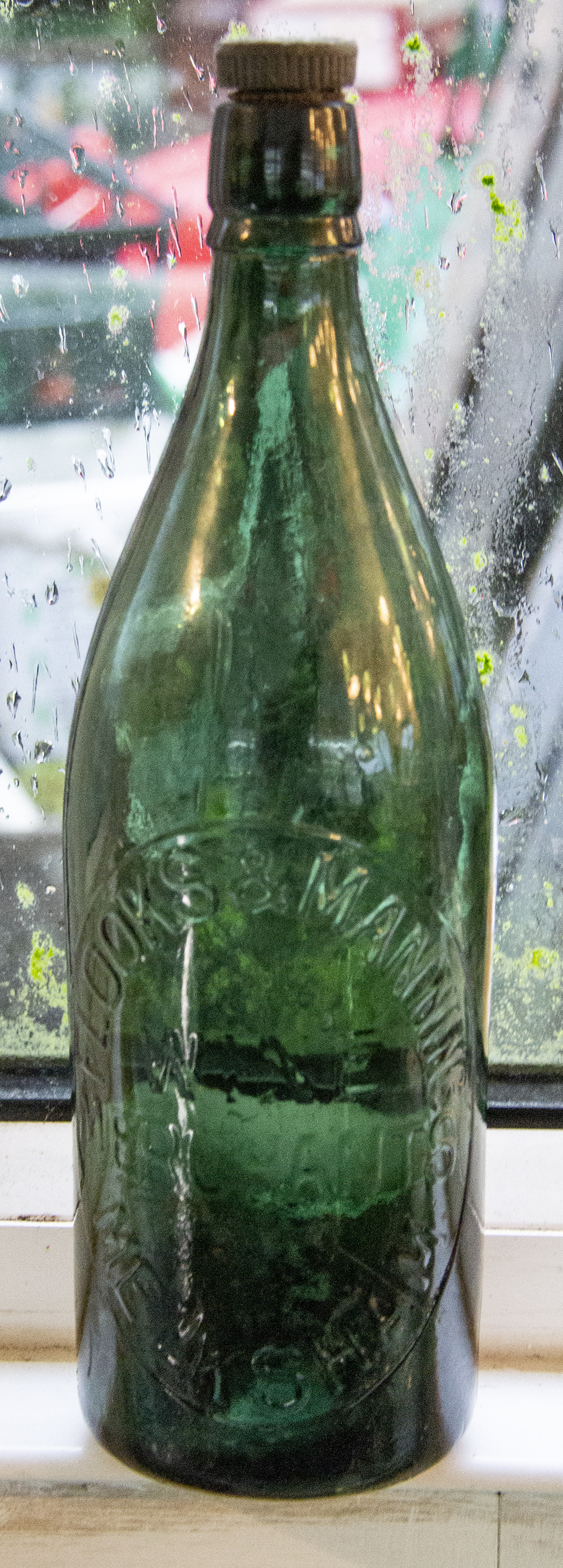 & MANNING / WINE MERCHANTS / MELKSHAM. P. & R. B. on base. (Powell & Ricketts, Bristol glassworks) Dark teal glass. |