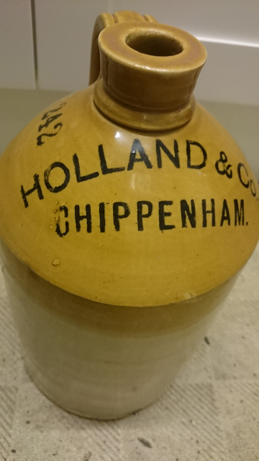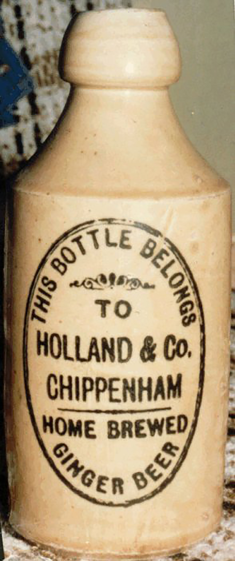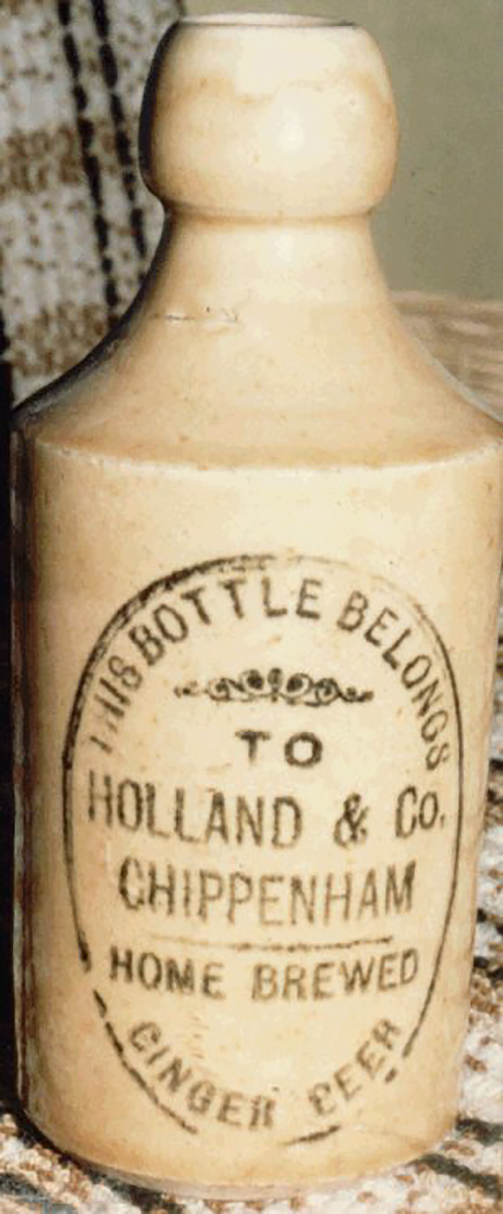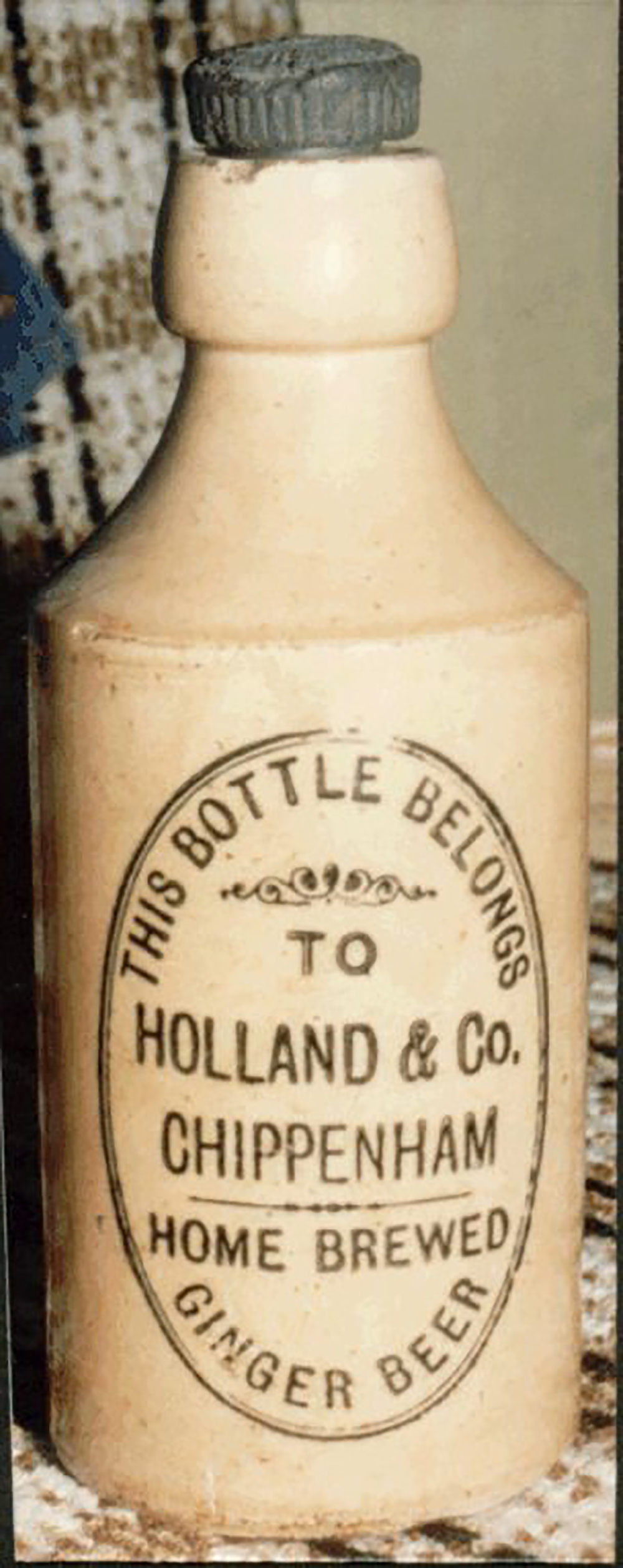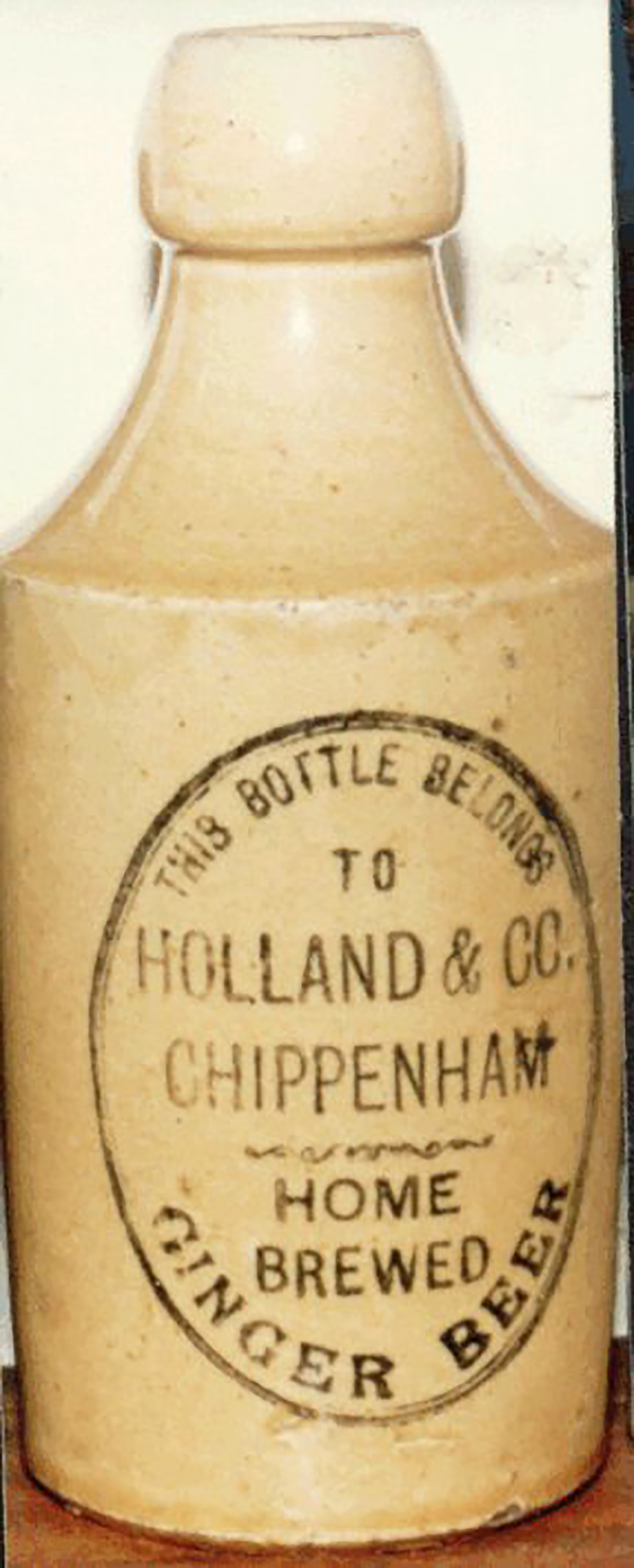 Printed: THIS BOTTLE BELONGS / TO / HOLLAND & CO. / CHIPPENHAM / HOME BREWED / GINGER BEER. Cork Stopper. Potter: Price 9 Bristol, Height 17.1cm (6.75"). |