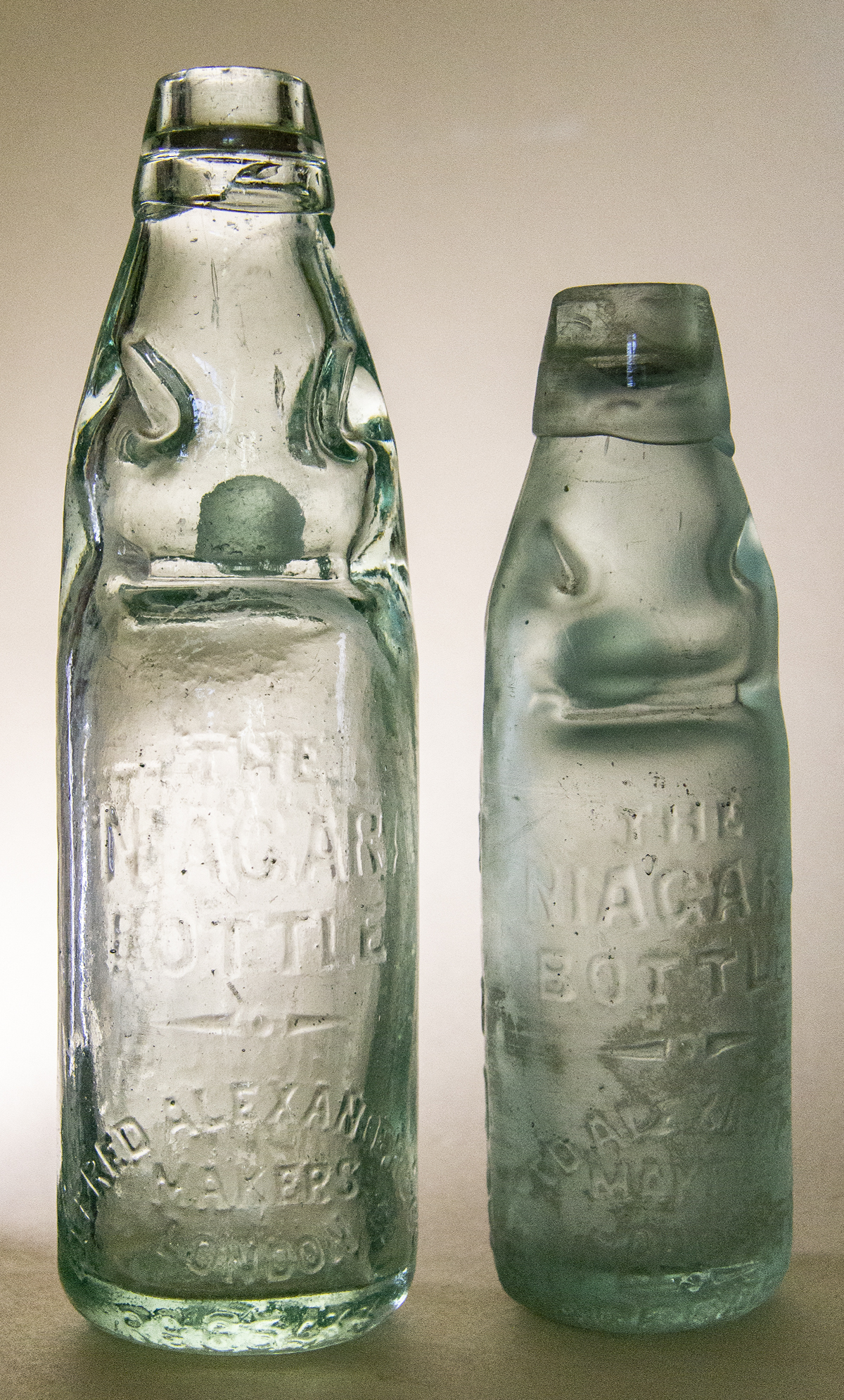 Rear: THE / NIAGARA / BOTTLE / ALFRED ALEXANDER / MAKERS / LONDON, Height 18.3cm (7.2") and 21.5cm (8.5"). |