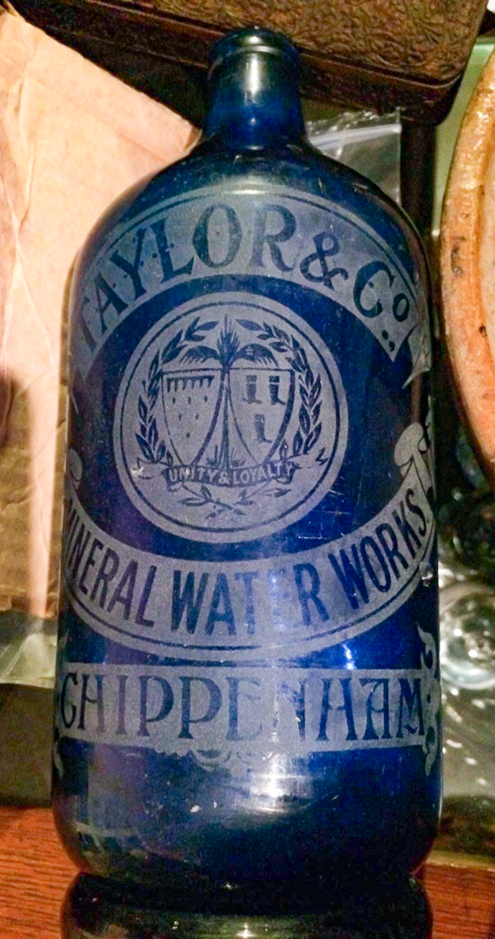 including Chippenham Coat of Arms. Cobalt Blue glass. Makers: ? 12" high. Image courtesy Paul Dawson. |